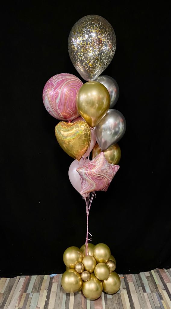Dit bouquet bestaat uit 1 confettiballon maatL, 1 orbz marble folie ballon, 2x 18 inch Folieballon en 6 latex ballonnen (behandeld met hi-float voor een langere zweefduur) ,