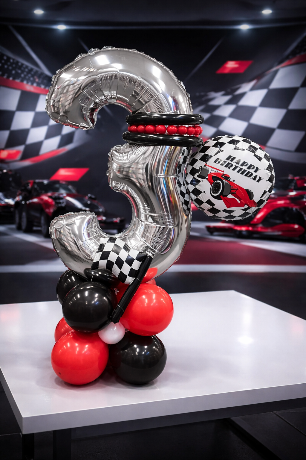 Aan de zijkant is een ronde folieballon met een Formule 1 afbeelding bevestigd, wat de decoratie perfect maakt voor een kinderfeestje of verjaardag. De ballonnen zijn professioneel gestyled en geplaatst op een strakke witte tafel, waardoor de kleuren extra goed tot hun recht komen.