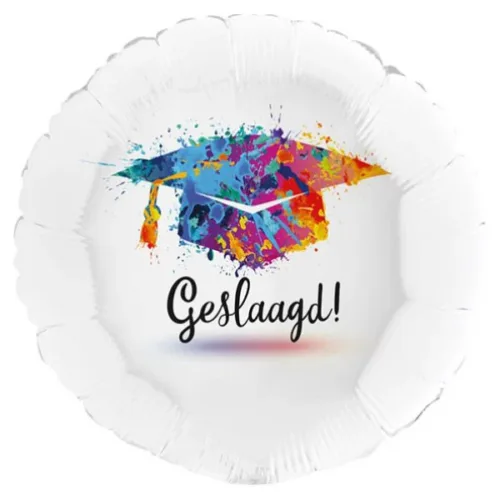 Deze 18 inch folie ballon met ‘Geslaagd’ opdruk heeft een doorsnede van circa 46 cm. De ballon is gemaakt van een lichtgewicht metallic folie waardoor deze gevuld met helium ongeveer één week blijft zweven. Opgeblazen is de ballon rond van vorm en aan twee zijden bedrukt. De ballon is verder voorzien van een zelfsluiter waardoor deze zichzelf afsluit wanneer de ballon volledig is gevuld.