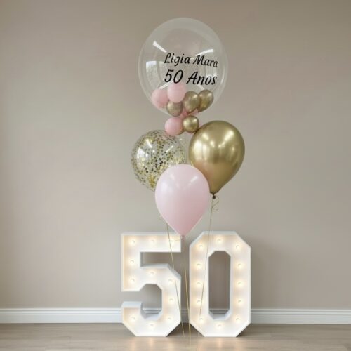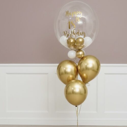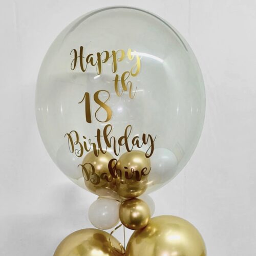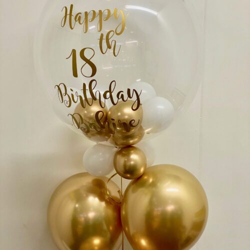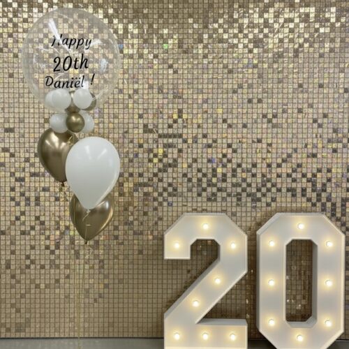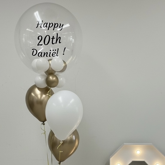 XL gepersonaliseerde ballon met helium gevulde ballonnen aan een ballongewicht, natuurlijk behandeld met Hi-Float voor een langere zweefduur.