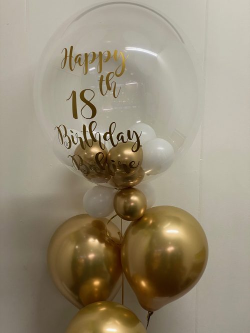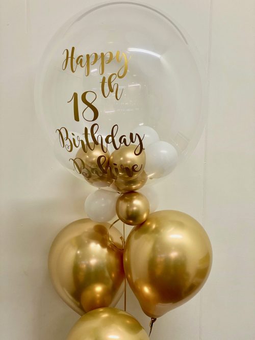 Tekst op de ballon is Goud, de inhoud bestaat uit kleine ballonnen.