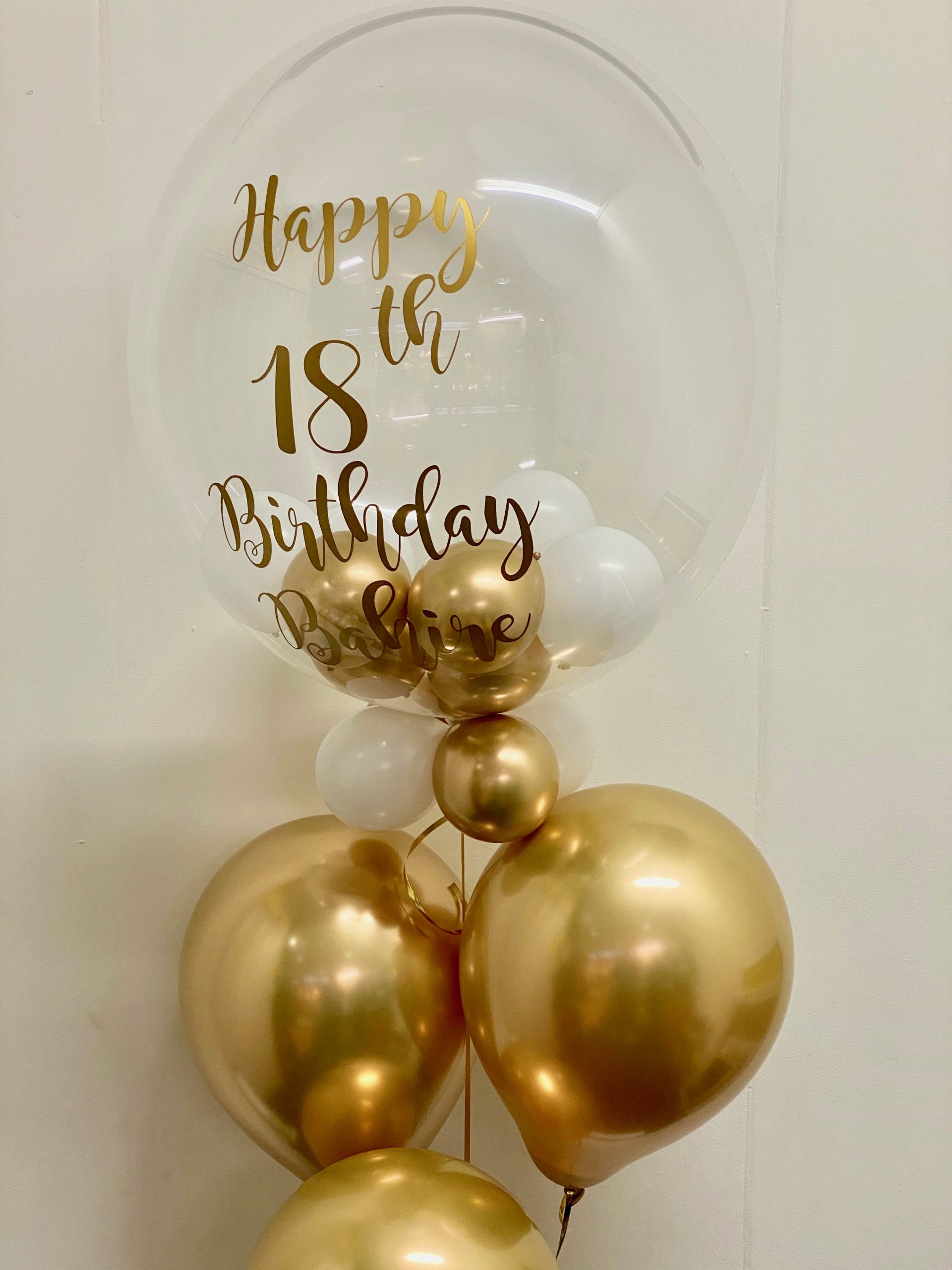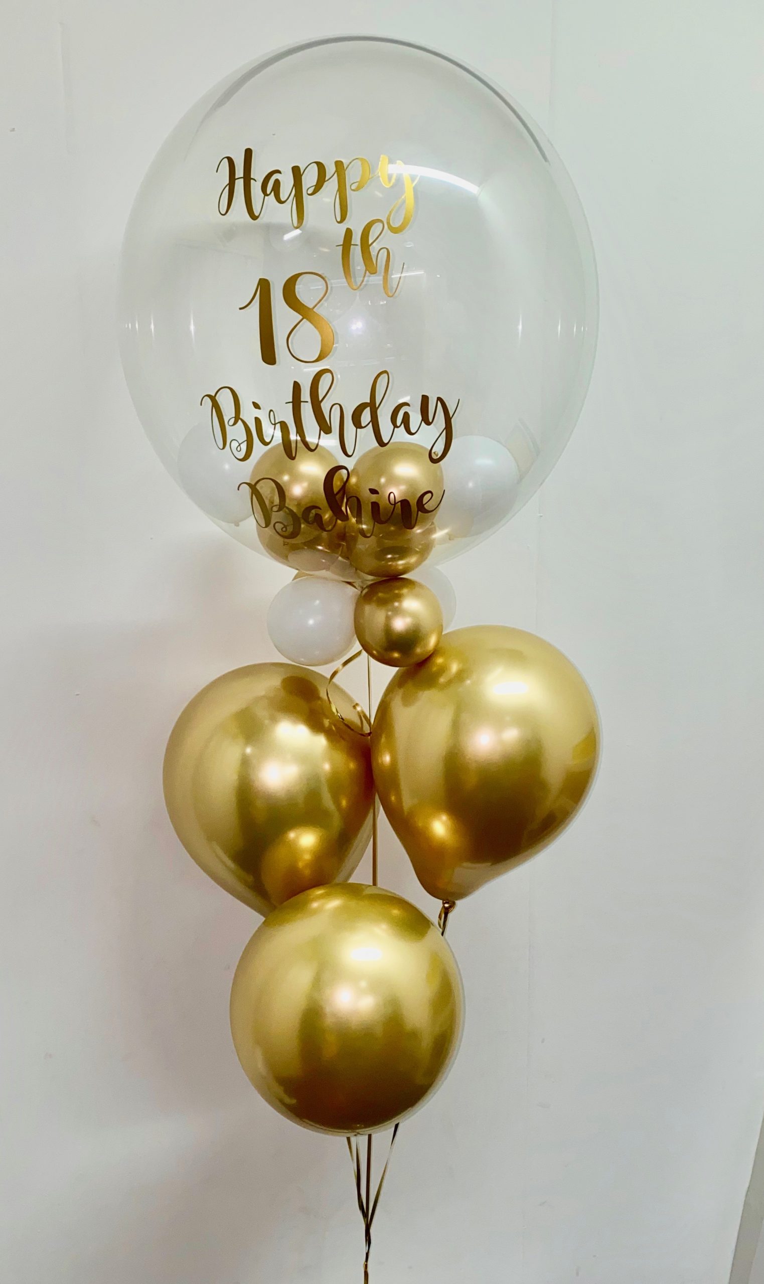 XL gepersonaliseerde ballon met 3 chrome ballonnen aan een ballongewicht, natuurlijk behandeld met Hi-Float voor een langere zweefduur.