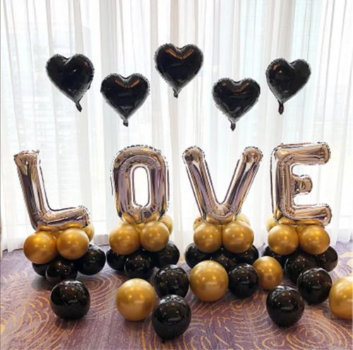 4 letterblokken, 5 helium harten op gewicht, en 9 luchtgevulde latex ballonnen.