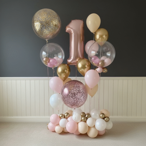 Dit prachtige show stuk wordt geleverd met 2 xl confettiballonnen, 2 bubblegum ballon (met kleine ballonnen), 2 xl cijfers (indien slechts 1 cijfer, passen wij dit aan met extra folie ballonnen), 10 helium ballonnen (met hi-float coating voor een langere zweefduur), en natuurlijk een luxe organic basis.