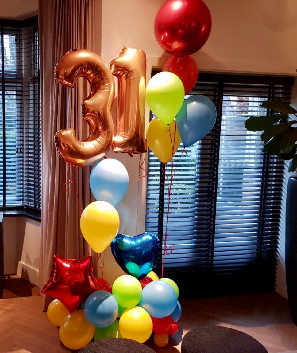 Dit prachtige show stuk wordt geleverd met , 2 xl cijfers (indien slechts 1 cijfer, passen wij dit aan met extra folie ballonnen), 6 helium ballonnen (met hi-float coating voor een langere zweefduur), 1 orbz folie ballon, 2 folie hart/ster en natuurlijk een luxe organic basis.