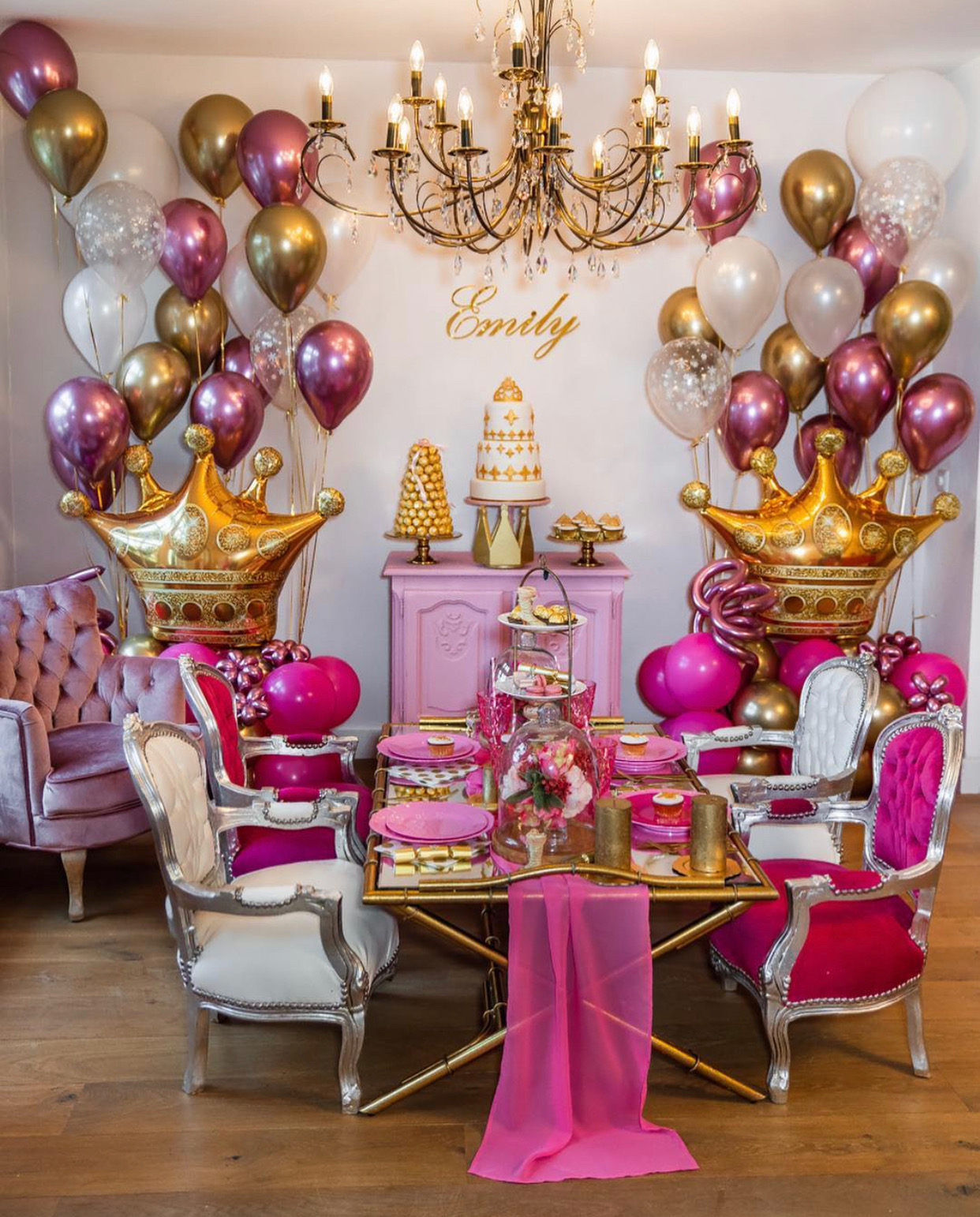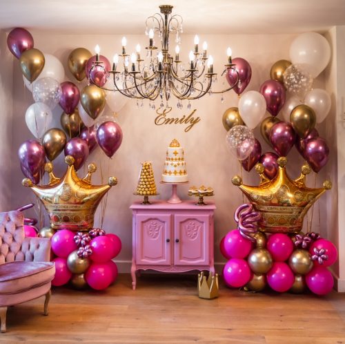 Dit prachtige show stuk wordt geleverd met 1 Gouden kroon, , 17 helium ballonnen (met hi-float coating voor een langere zweefduur), 1 orbz folie ballon en natuurlijk een luxe organic basis.